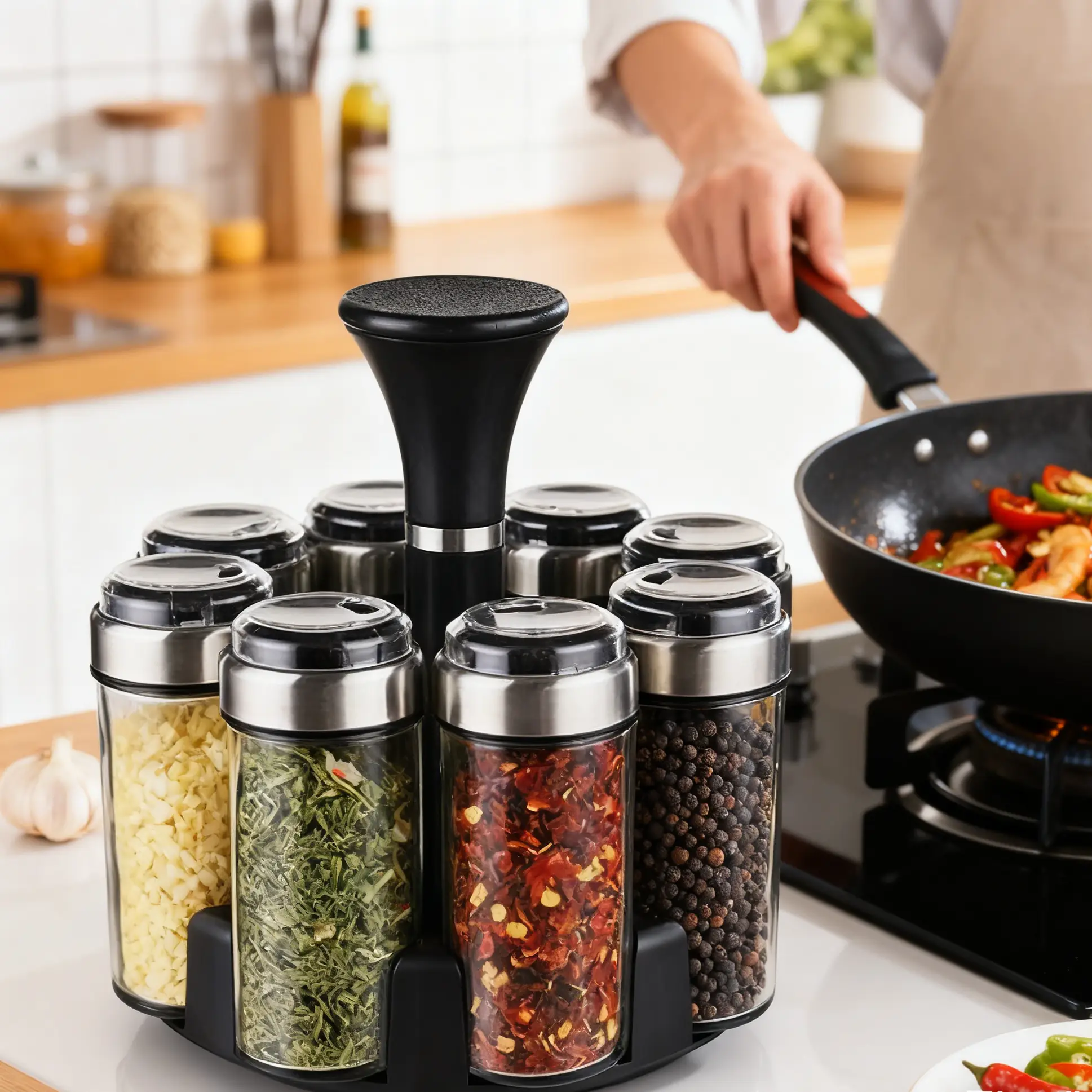 ‘Grab-and-Go’ Ergonomic Center Handle Design: The distinctive flared central column of this spice carousel serves as a robust, comfortable carrying handle. This “grab-and-go” design is quite useful since it makes it simple to move the complete Revolving Countertop Spice Rack from the cabinet to the counter or straight to the dining table with a safe, one-handed hold. The sleek black, non-slip handle and base give the rack solidity and a contemporary look, turning it from a basic storage device into a portable seasoning station—a feature that is uncommon in typical rotary racks.