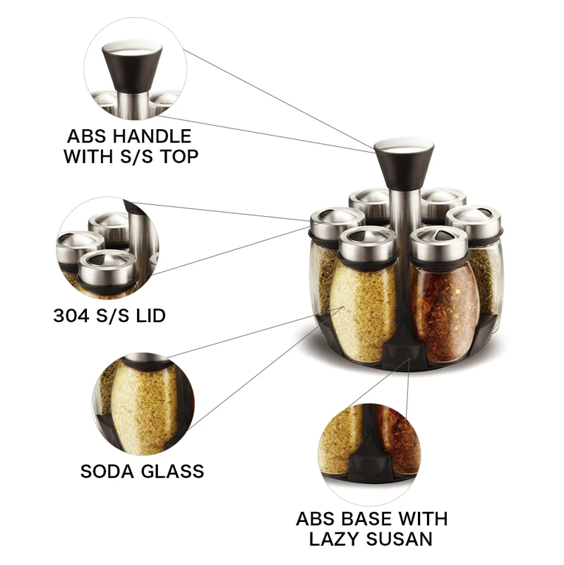 Clear Glass Body for Easy Identification: The transparent glass body with a rotating spice holderallows you to clearly see the contents inside. This makes it easy to identify different spices at a glance without opening the lid. You can also monitor spice levels and know exactly when a refill is needed. Glass does not absorb odors or colors, helping maintain the original flavor of your spices. It is hygienic and easy to clean. The clarity also adds a premium, clean aesthetic to your kitchen.