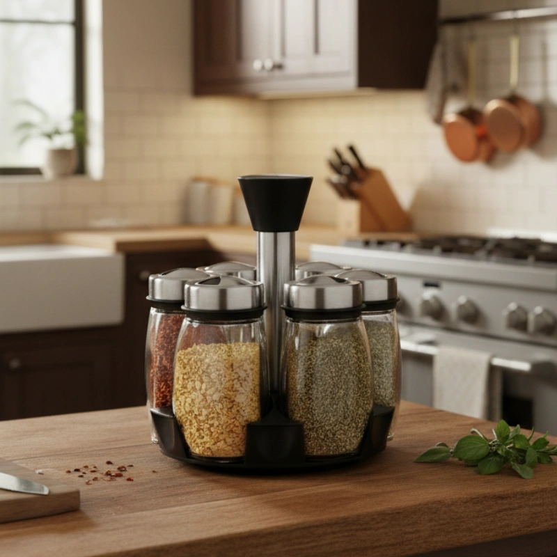 Space-Saving Rotating Stand for Organized Storage: The spice bottles with a rotating spice holder are neatly arranged on a compact rotating stand, keeping everything organized in one place. The circular design saves countertop space while maximizing storage capacity. A rotating base allows quick and easy access to any spice without moving multiple bottles. This setup helps keep the kitchen tidy and efficient. It is ideal for small kitchens or minimalist layouts. The uniform arrangement also creates a visually pleasing display. Contact us now to receive competitive wholesale pricing and detailed product specifications.