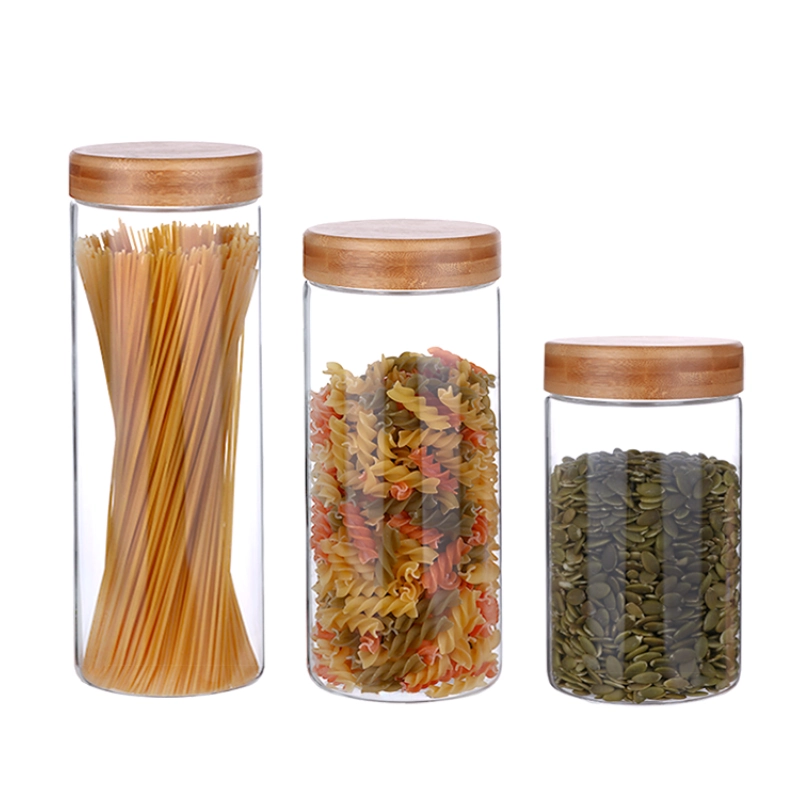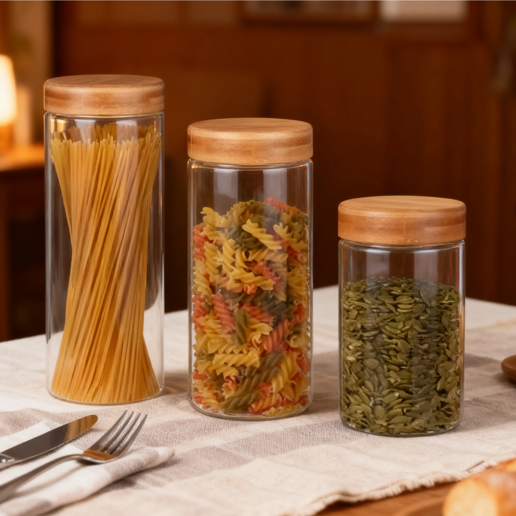 Premium Aesthetic and Design: This glass canister with wood lid set instantly elevates your kitchen and pantry with its premium aesthetic, featuring a modern, minimalist marriage of clear, highly transparent glass and a warm, natural wood lid. This sleek, Scandinavian-inspired design acts as both a practical storage solution and a beautiful piece of decor, allowing your items—like colorful pasta or specialty grains—to be visually showcased while seamlessly complementing any interior style, from contemporary to rustic.