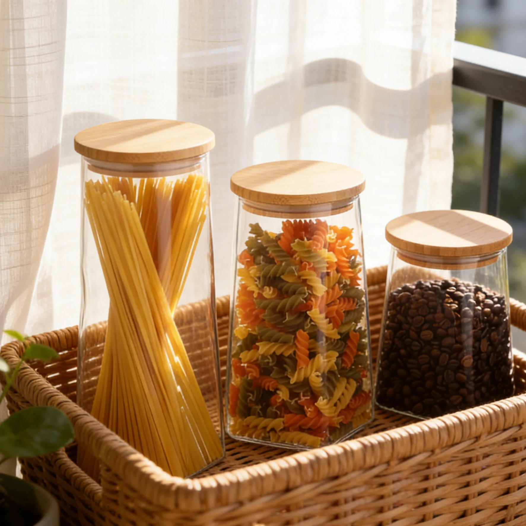 A Special Tapered Square Design for Maximum Area: The most notable aspect of these bamboo food storage containers is their unique, slightly tapered form. The Square Glass Canisters fit side by side without wasting critical cabinet space thanks to their form, which maximizes vertical and horizontal storage. They are the best Airtight Kitchen Storage option for compact or congested pantries because of this clever design decision that not only improves the visual appeal but also offers exceptional space efficiency.