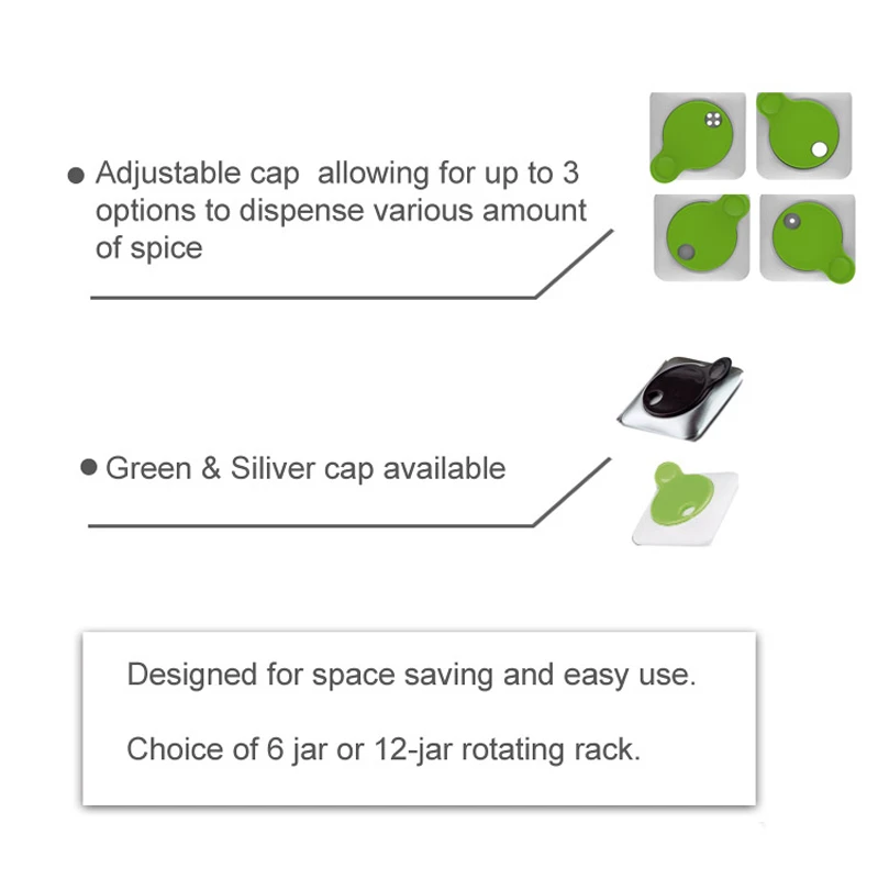 Customizable Dispensing with Q-Lids: The Spice Racks Rotating Organizer’s innovative adjustable cap offers up to three different dispensing options, allowing you to control the flow for everything from fine powders to coarse dried herbs.